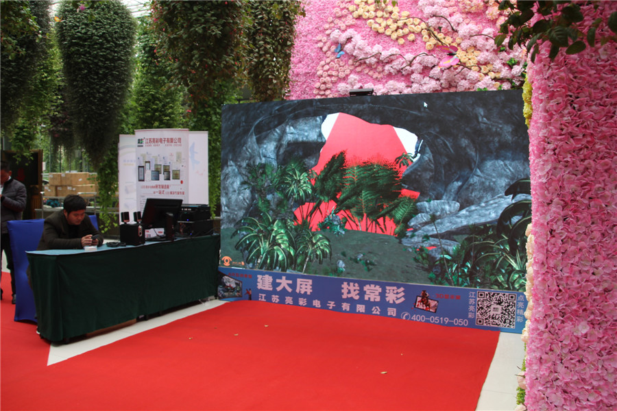 At the entrance of the conference hall, Jiangsu bright color electronic display of the hottest LED+3D+AR technology, through the big screen and human interaction, many participants in the side of the crowd, also want to experience a.